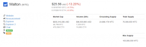 Technically Waltonchain token (WTC) total supply is not more than 70,000,000 WTC with 24,898,178 WTC as a current supply. That is slightly less than Ethereum’s total supply, meaning that we could see a higher price per unit when Walton reaches Ethereum’s current market cap.