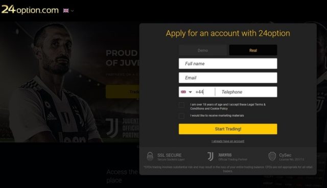 You’ll then get the option of setting up either a demo or real money account. Choose your preference and fill out the form as shown above. Click “Start Trading!” to process your account registration.